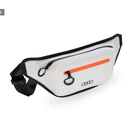 "Your perfect travel companion: the water-repellent Audi hip bag in light grey convinces with a large main compartment and a small outer compartment ‚ perfect for on the go. Details: - Water-repellent hip bag with large main compartment - Small outer compartment with zip Branding: - Audi rings print on the outside Dimensions: - Approx. 21 x 7.5 x 14 cm Material: - 420D textured TPU, waterproof Colour: - Light grey