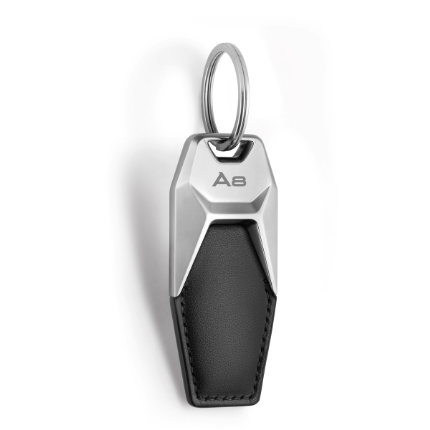An accessory in a class of its own ‚ the cowhide leather key ring with Audi A8 engraving. Details: - Audi key ring in Audi design - Three-dimensional metal body in combination with black cowhide - With split ring - Engraved Audi A8 logo - Made in Germany Material: Cowhide, metal, padding: TPE plastic Colour: Black/silver