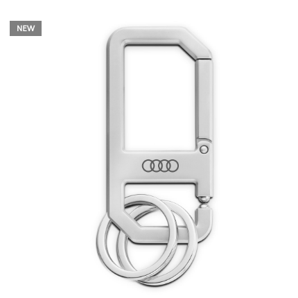 The practical Audi keychain connects your key rings with an innovative ball lock and offers a secure grip thanks to the robust snap hook. Details: - Keyring with ball lock and snap hook - Ball lock for easily clicking the key rings in and out - Snap hook for attaching the keychain (e.g., to a bag) Branding: - Audi rings on the snap hook Material: - Cast metal with aluminium matt coating Colour: - Silver