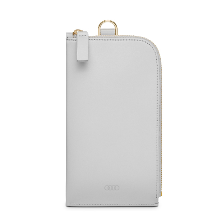 Functionality and aesthetics combined: The slim smartphone case made of high-quality Italian leather offers protection for your smartphone and is at the same time a noble accessory. Details: - Slim smartphone case made of Italian cowhide leather with color accents in light gold - Metal zipper over two sides - Slip pocket for smartphone (sizes up to iPhone 14 and Samsung Galaxy S22 or 23) - Three card slots inside - D-ring for attachment to the lanyard - RFID protection Branding: - Embossed Audi rings Metrics: approx. 18 x 10 x 1.5 cm Material: Cowhide (Leather Working Group certified tannery), polyester, metal Colour: Grey/Light Gold