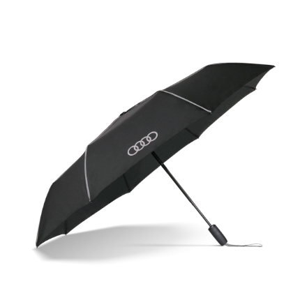 Protect yourself from the rain and think about the environment too: waterSAVE cover material is used in the production of the Audi pocket umbrella, for which a dyeing process is used that reduces both consumption of valuable raw materials as well as energy consumption and environmental impact with hazardous matter. Details: - Double automatic umbrella with eight panel sections - Windproof system - Reflective piping in each wedge seam - Handle with integrated release button and loop in a contrasting colour - Sheath with snap button and silver piping - Button on closure strap Branding: - Reflective Audi rings print on one panel section - Raised Audi rings on the handle - Sheath with Audi rings logo Dimensions: - Diameter: 104cm - Length when closed: 31cm - Weight: 394g Material: - Canopy: 100 % polyester - Handle: plastic - Stick: steel stick Colour: black