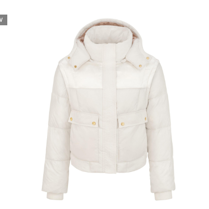 The practical Audi women's puffer jacket with removable hood and sleeves is your stylish companion for indoor and outdoor activities. Details: - Warm padded jacket with detachable sleeves and hood for 4-in-1 function - Versatile: for use indoors as well as outdoors - Semi-high stand-up collar - Knitted cuffs - Front zip with panel - Front pockets with press studs in light gold - Mix of material tones with subtly shiny fabric at the top of the shoulder and the outside of the hood - Matt material on the sleeves and lower torso - Inside of the hood and lining in the colour sand provide a subtle colour contrast - Inside pocket with story print Branding: Audi rings as a subtle print on hood and collar and Audi rings on the neck label and with embossed Audi rings on zipper puller. Material: Outer fabric 1: 100% polyester (recycled) Outer fabric 2: 61% polyester, 39% polyamide Lining: 100% polyester (recycled) Wadding: 100% polyester (recycled) Care instructions: - Do not wash - Do not tumble dry Colour: Creme