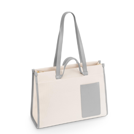 A fusion of functionality and elegance: The Audi women's shopper is a stylish accessory and a practical companion at the same time. Details: - Versatile canvas tote bag made from recycled polyester in a casual, elegant style - Italian cowhide details in contrasting color - Long carrying straps and short carrying handles - Spacious main compartment with zipper - Padded compartment for laptops up to 14 inches - Separate zipper compartment inside - Practical D-ring inside for attaching key rings, etc. - Reinforced pocket bottom Branding: - Embossed Audi rings on leather case on the outside Dimensions: approx. 41 x 15 x 31 cm (W x D x H) Material: Main material: recycled polyester Contrast material: cowhide leather (Leather Working Group certified tannery) Colour: Cream/Grey