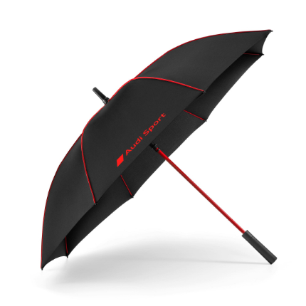 Protect yourself from the rain and think about the environment too: waterSAVE cover material is used in the production of the Audi Sport stick umbrella, for which a dyeing process is used that reduces both consumption of valuable raw materials as well as energy consumption and environmental impact with hazardous matter. Details: - 12 mm steel stick with red plastic coating - Fiberglass rails in red, connecting strands in black - Straight soft-touch handle including adapter with trigger button - Windproof system - Automatically opening - Red piping in each key seam - Closure strap with Velcro - Number of wedges: 8 - Diameter: approx. 120 cm - Single-color, red Audi Sport logo print on an umbrella segment and black doming sticker with white Audi rings on the handle Material: - Canopy: 100 % polyester - Handle: plastic - Stick: steel stick with plastic coating - Poles: fiberglass Colour: Black/red