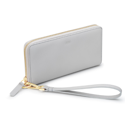 Practical and elegant at the same time: With the spacious Audi women's wallet, you have enough space for clear and secure storage of money and cards. Details: - Wallet made of Italian cowhide leather with colour accents in light gold - Circumferential metal zipper - Detachable wrist strap with carabiner - 12 card slots, coin pocket with zipper, large open pocket - RFID protection - Made in Europe Branding: - Embossed Audi rings Dimensions: approx. 19 x 10.5 x 2.5 cm Material: Cowhide (Leather Working Group certified tannery), polyester, metal Colour: Grey/Light Gold